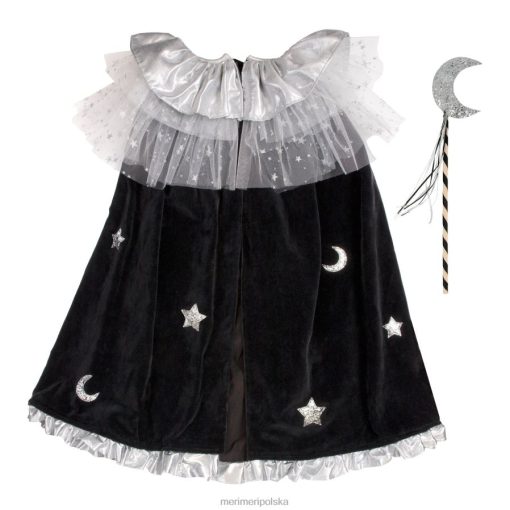 Przemień się w wiedźmę dzięki temu elegancko i przerażającemu kostiumowi. zawiera pelerynę i różdżkę wykonaną z aksamitu, tiulu i srebrnej lamy ze srebrną, brokatową gwiazdą i detalami księżyca. wspaniały strój na Halloween lub zawsze, gdy masz ochotę rzucać zaklęcia w wielkim stylu!