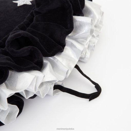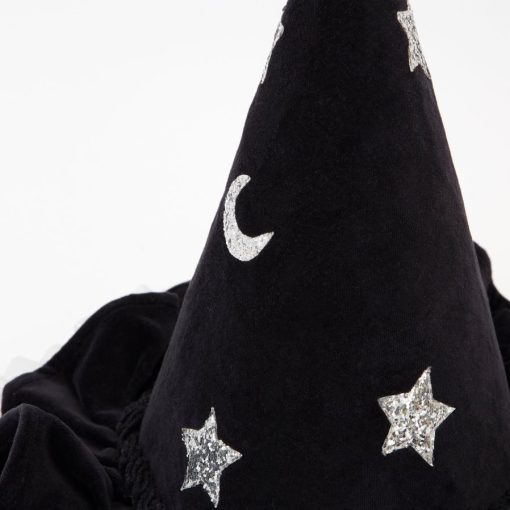 ten kapelusz wiedźmy z marszczonymi detalami jest naprawdę bardzo stylowy. jest wykonany z czarnego aksamitu, ze srebrnymi lanymi i srebrnymi brokatowymi gwiazdami i księżycami. niezbędny dodatek na Halloween lub dodatek do pudełka z przebierankami, pozwalający na pomysłową zabawę o każdej porze roku.