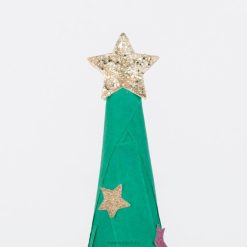 Wyobraź sobie wyraz twarzy dziecka, gdy rozpakowuje ten wspaniały rożek choinkowy pokryty papierem krepowym, wypełniony prezentami! zdejmij warstwy, aby odsłonić papierową czapkę ze złotej folii, naklejki, tymczasowe tatuaże i ciekawostki. następnie w strzępach papieru odkryj kopertę zawierającą oszałamiający naszyjnik z emaliowaną gwiazdą.