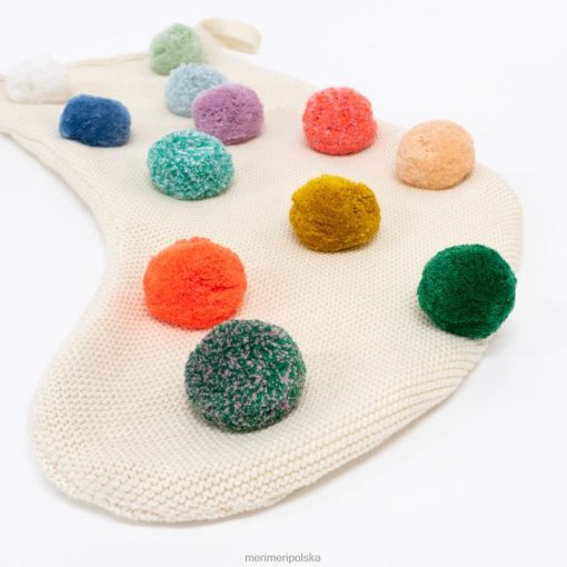 po co mieć zwykłą pończochę, skoro ma się ją pokrytą modnymi pomponami w tęczowych kolorach ta rewelacyjna pończocha będzie wyglądać niesamowicie powieszona, gotowa do wypełnienia mnóstwem prezentów.
