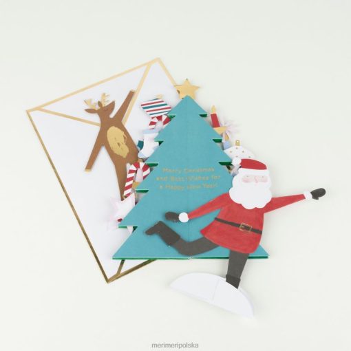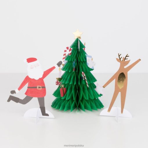 ta niesamowita kartka jest naprawdę wyjątkowa do dawania i otrzymywania, ponieważ jest także wspaniałą dekoracją świąteczną 3D. Zawiera Świętego Mikołaja, renifera i udekorowane drzewo o strukturze plastra miodu, co gwarantuje, że wszyscy poczują się świątecznie!