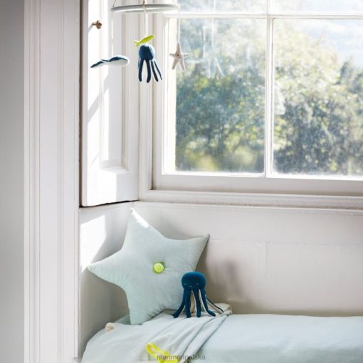 ta urocza grzechotka-ośmiornica, wykonana z miękkiej dzianiny organicznej, zachwyci maluchy słodką haftowaną buzią i zwisającymi ramionami.