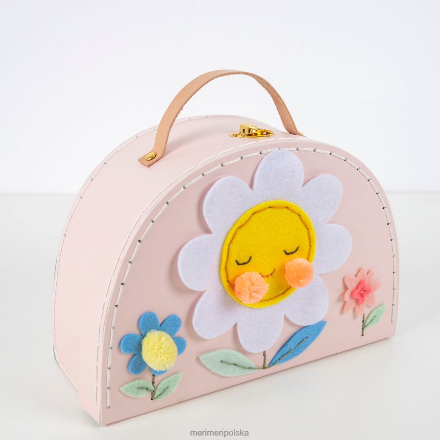 Dzieci, które kochają rękodzieło i mini walizki, z pewnością pokochają ten zestaw walizek. zawiera miękkie filcowe elementy i nić do haftu, które tworzą z przodu bajeczną, wesołą scenę kwiatową, z uroczymi pomponami. możesz także spersonalizować walizkę, wyszywając imię z tyłu, pod napisem „to należy do…”.